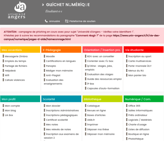 D’ailleurs, en plus d’une mise en place de la plateforme de bienvenu pour le nouvel étudiant, l’Université d’Angers a mis en ligne un espace numérique de travail ou ENT, pour faciliter la communication entre les étudiants, les parents et les enseignants dans cette institution pluridisciplinaire.